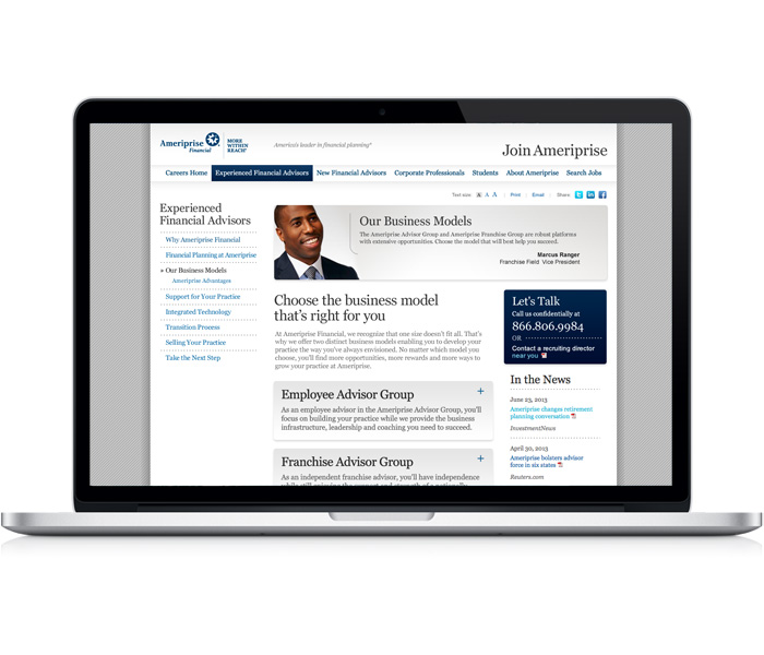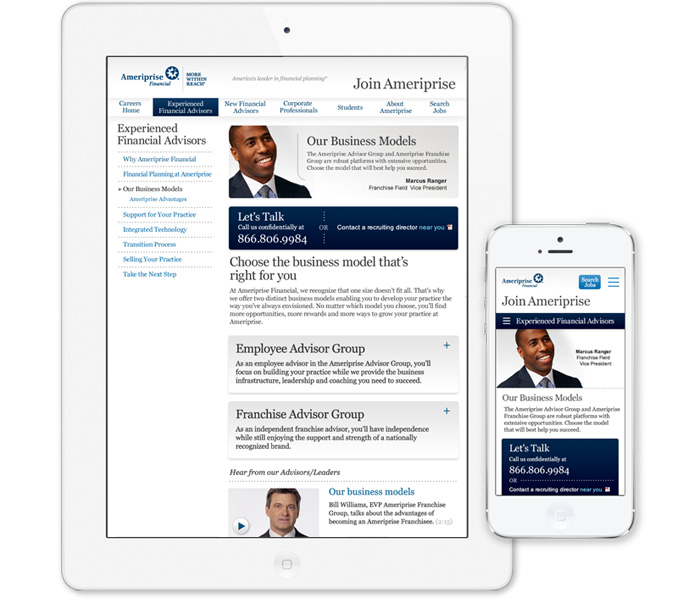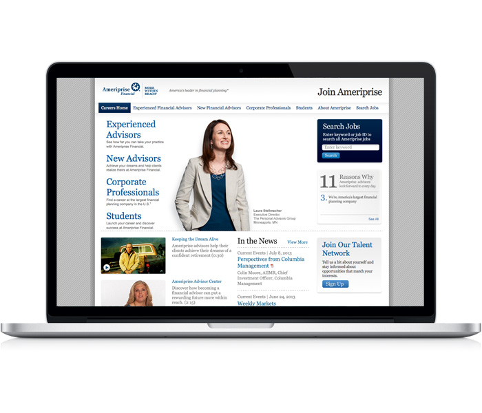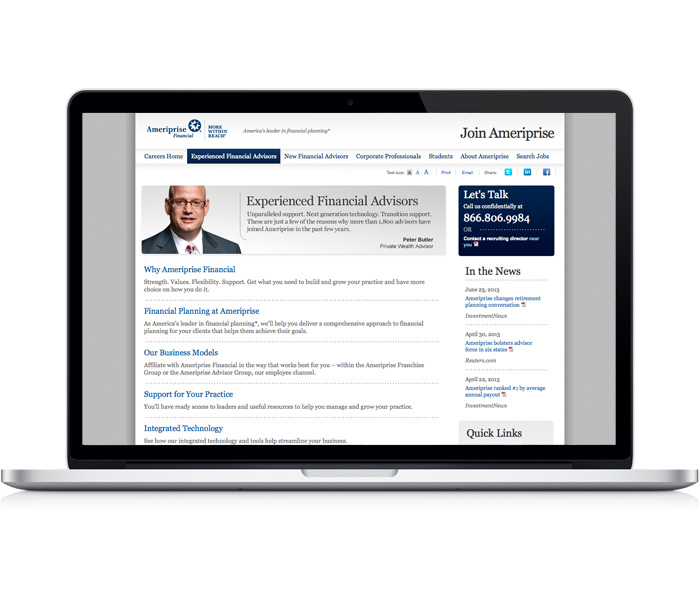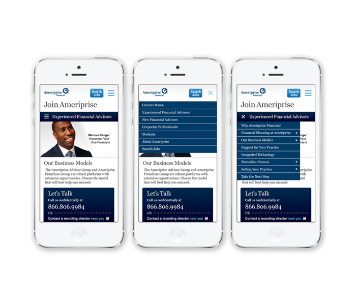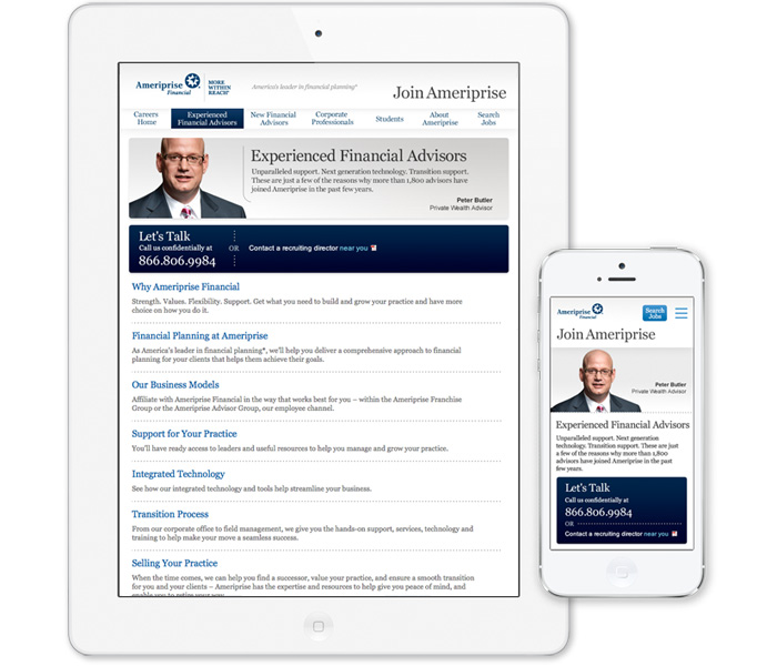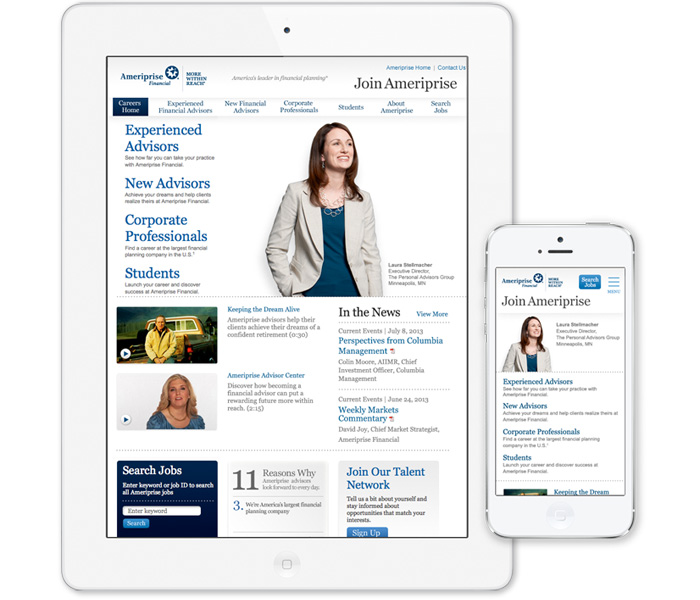 Collaborated with information architect to implement responsive design on the Ameriprise career site as a proving ground for other Ameriprise mobile platform implementations.