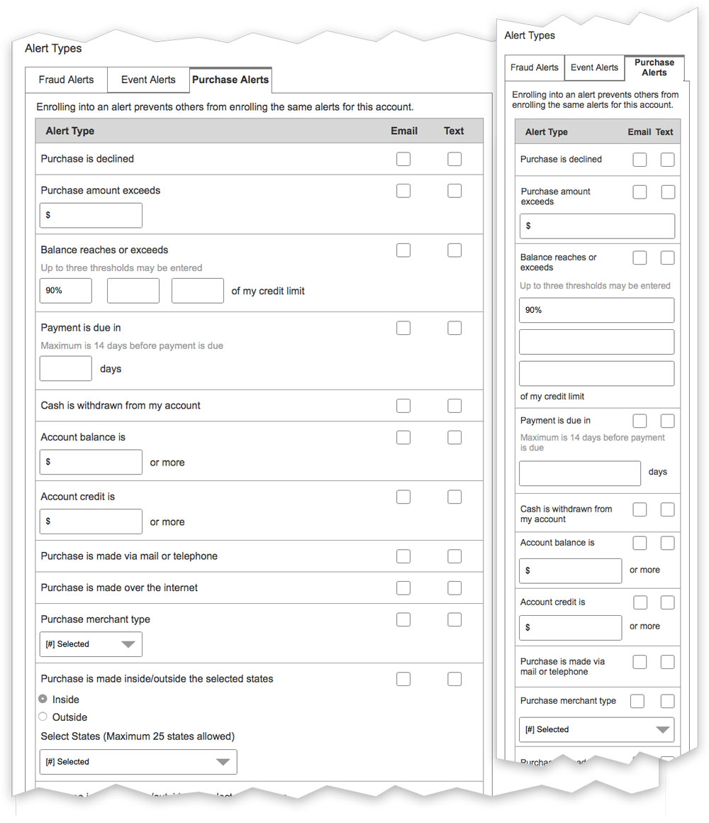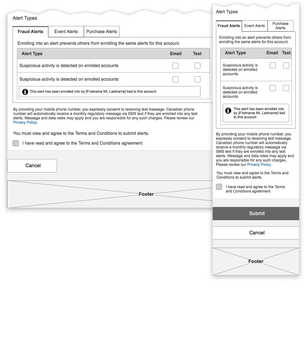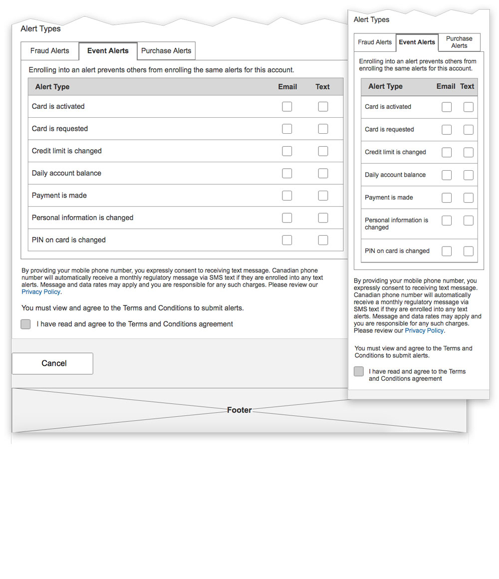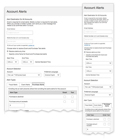 Replaced existing account alert notification with more robust, customizable, and updated alerts and email and text notifications UX and VID. Used card sorts and usability testing to refine. View mockups.