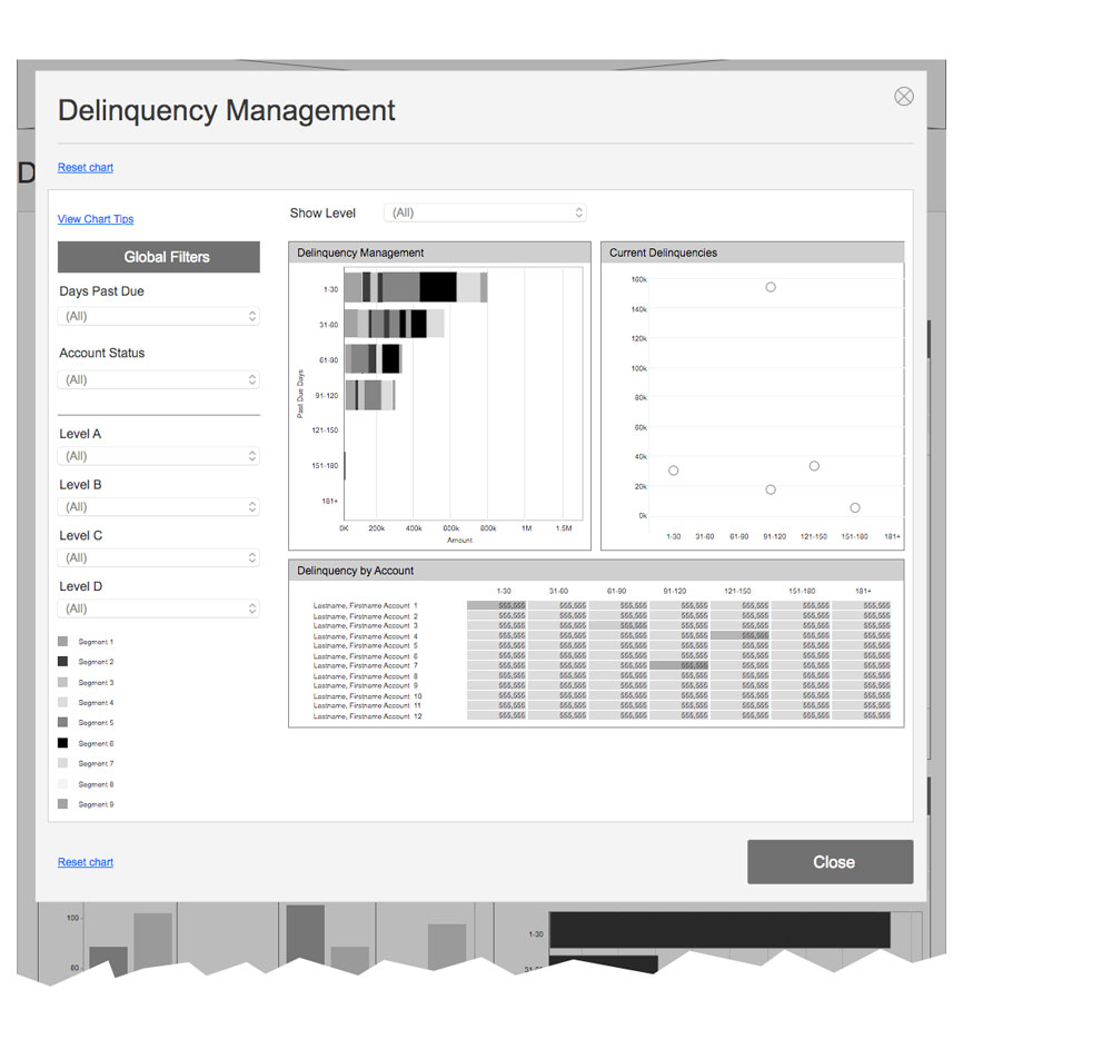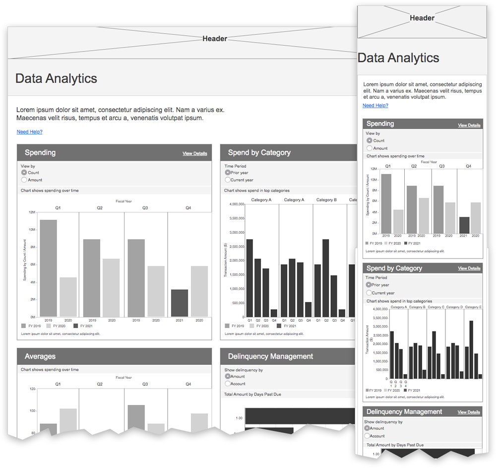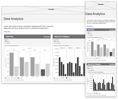 To enable users to view their reporting data visually, a first for the platform, I collaborated with the Product owner and Tableau developer to design a dashboard showing summary data views for spending, and detailed views with filters to provide granularity to the data. View mockups